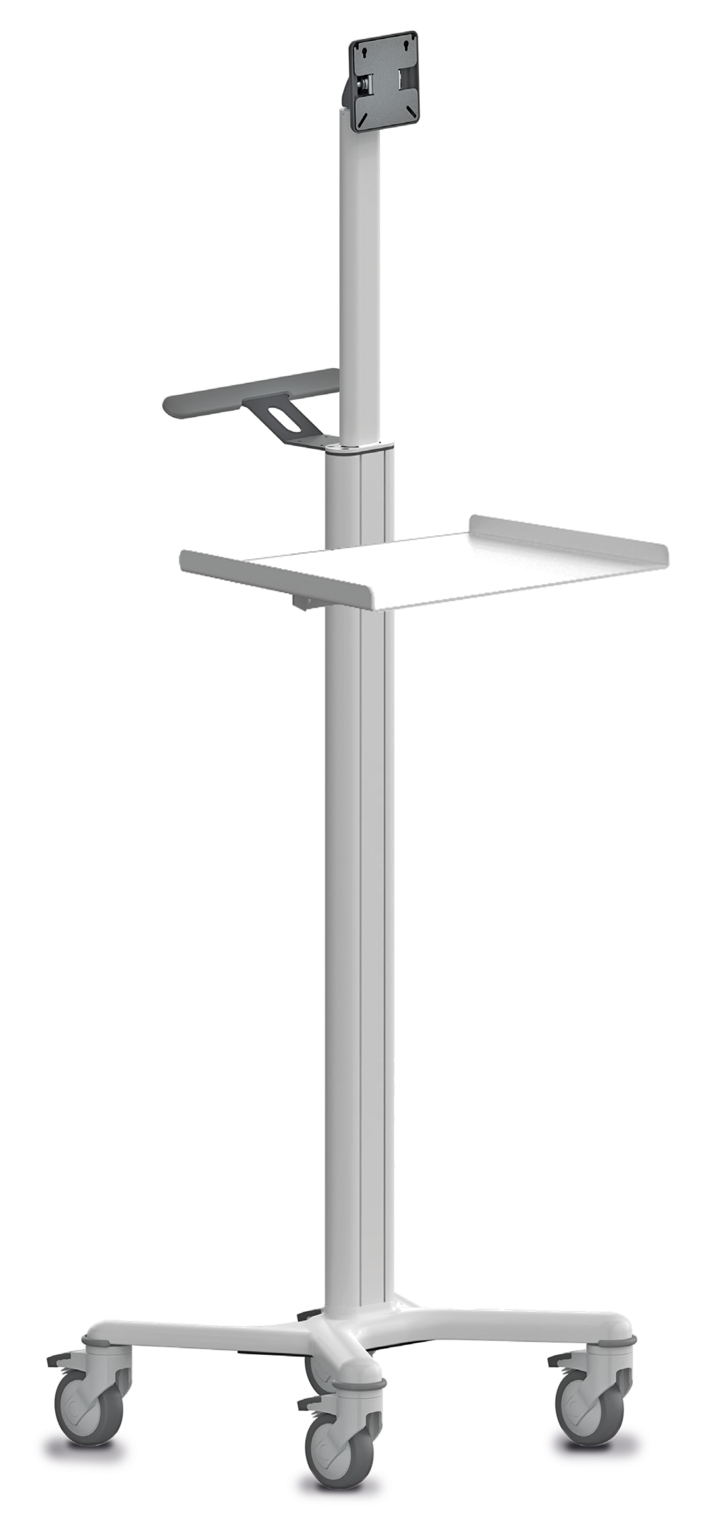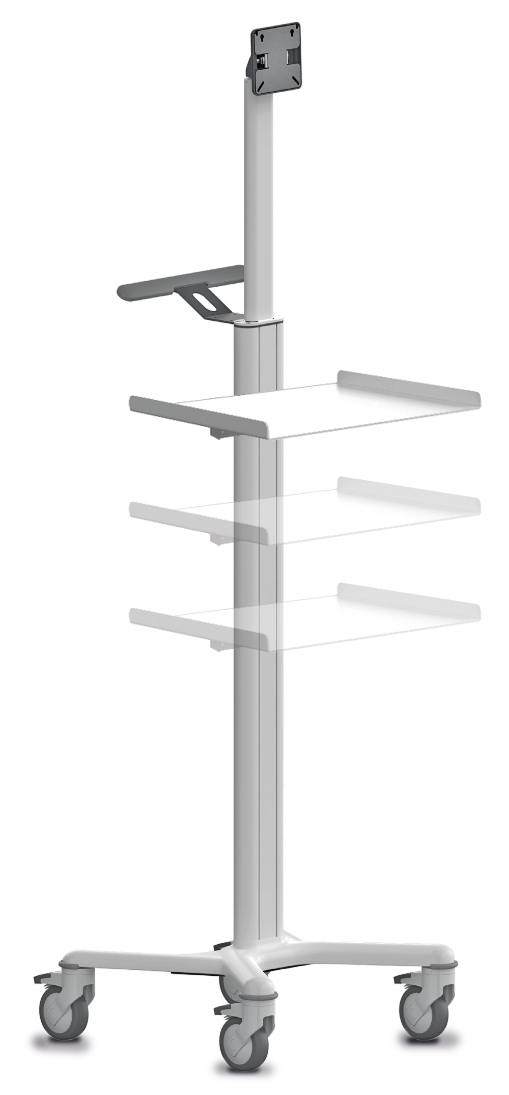Die Ablage ist 30 cm lang, belastbar bis ca. 4 kg und lässt sich mühelos in der gewünschten Höhe an der Trolleysäule montieren. So können Sie Ihren Trolley individuell an Ihre Bedürfnisse anpassen und ihn in eine praktische, fahrbare Arbeitsstation verwandeln.